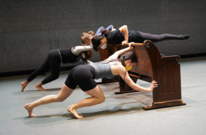 Students in rehearsal for a new work by Princeton senior Molly Gibbons, “Mind Furniture,” that reckons with the orthodoxies, thoughts, choices, and meanings that constitute the inner life and experiencing the drama of the soul, part of the senior dance concert, Reverence, on March 18 & 19. Photo by Jon Sweeney